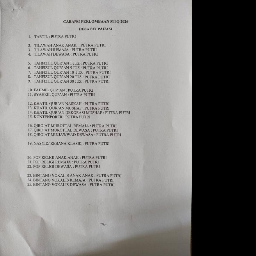Sei Paham, Musabaqoh Tilawatil Qur'an (MTQ) tinggat Desa akan dilaksanakan pada tanggal 31 Januari sampai dengan 01 Febuari 2026. Di Musholla Istiqlal Dusun VIII Desa Sei Paham. Kepada seluruh masyarakat desa Sei Paham yang ingin mengikuti perlombaan agar segera mendaftarkan diri dan keluarga.