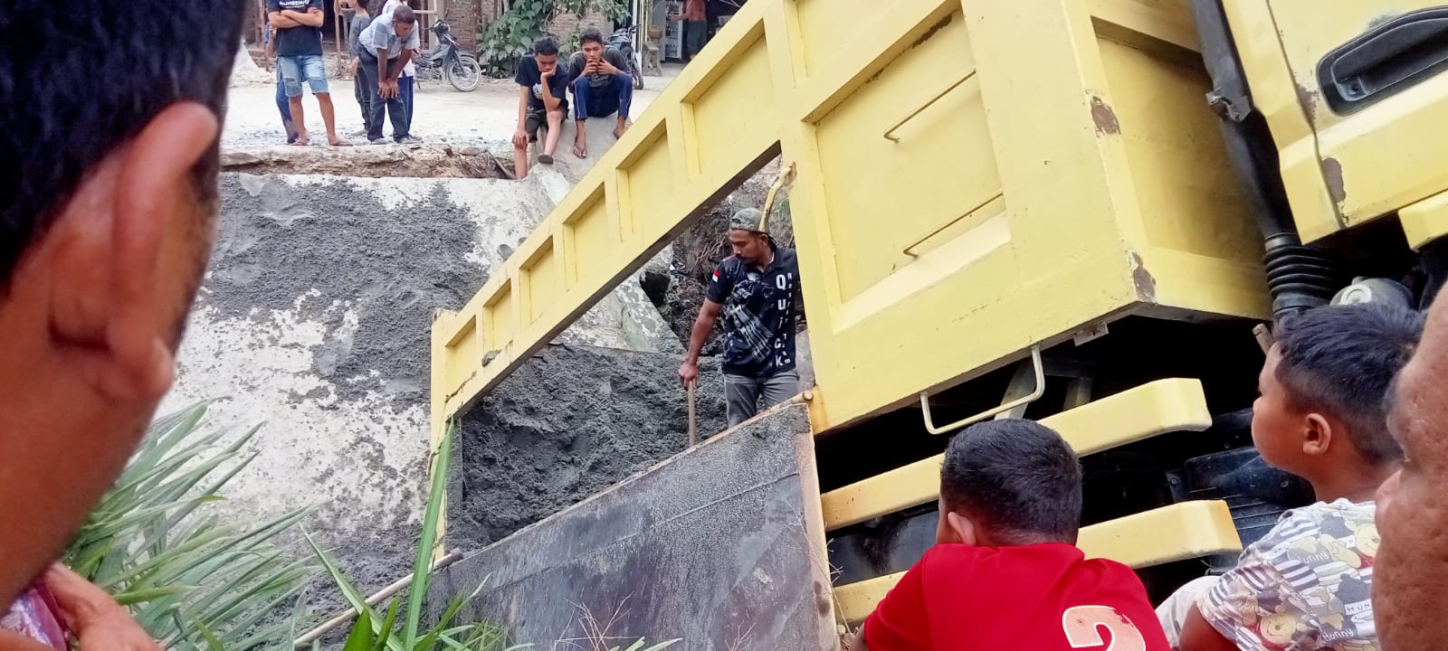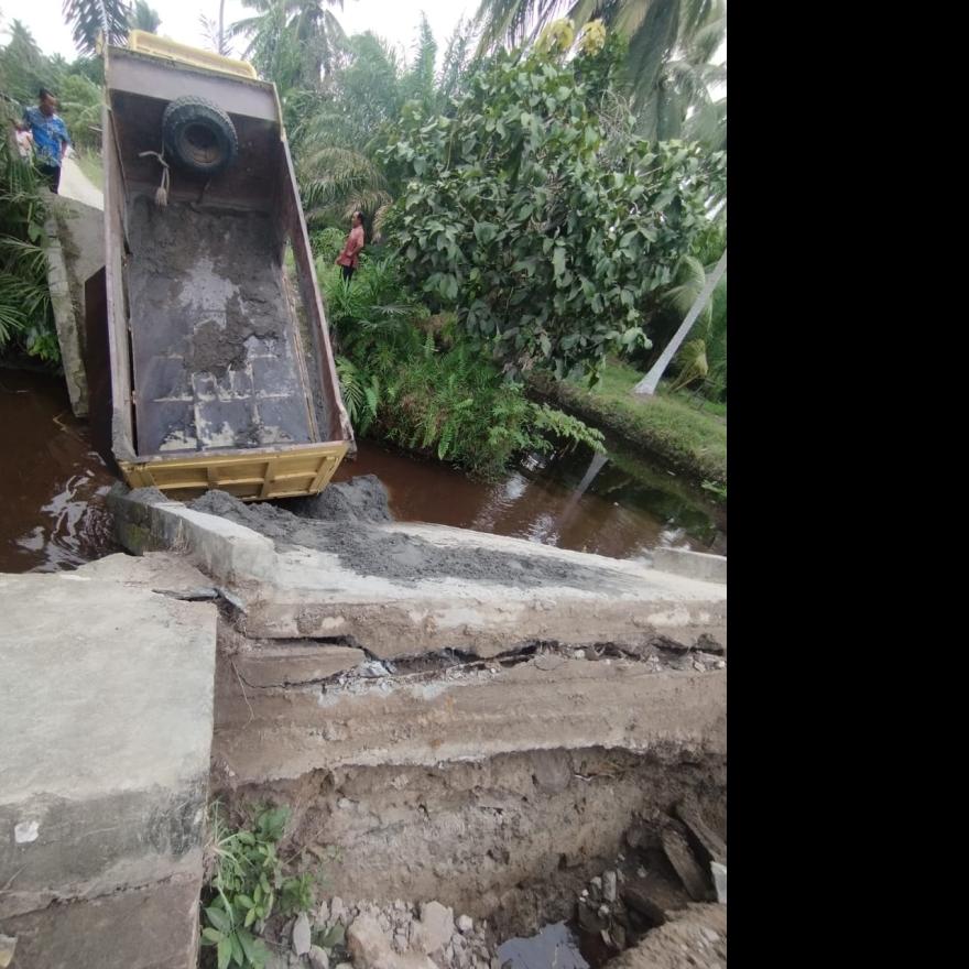 Warga secara bergotong royong dan swadaya masyarakat membuat jembatan darurat menggunakan batang pohon kelapa agar aktivitas masyarakat dapat berjalan / tidak terganggu Sebagaimana mestinya.